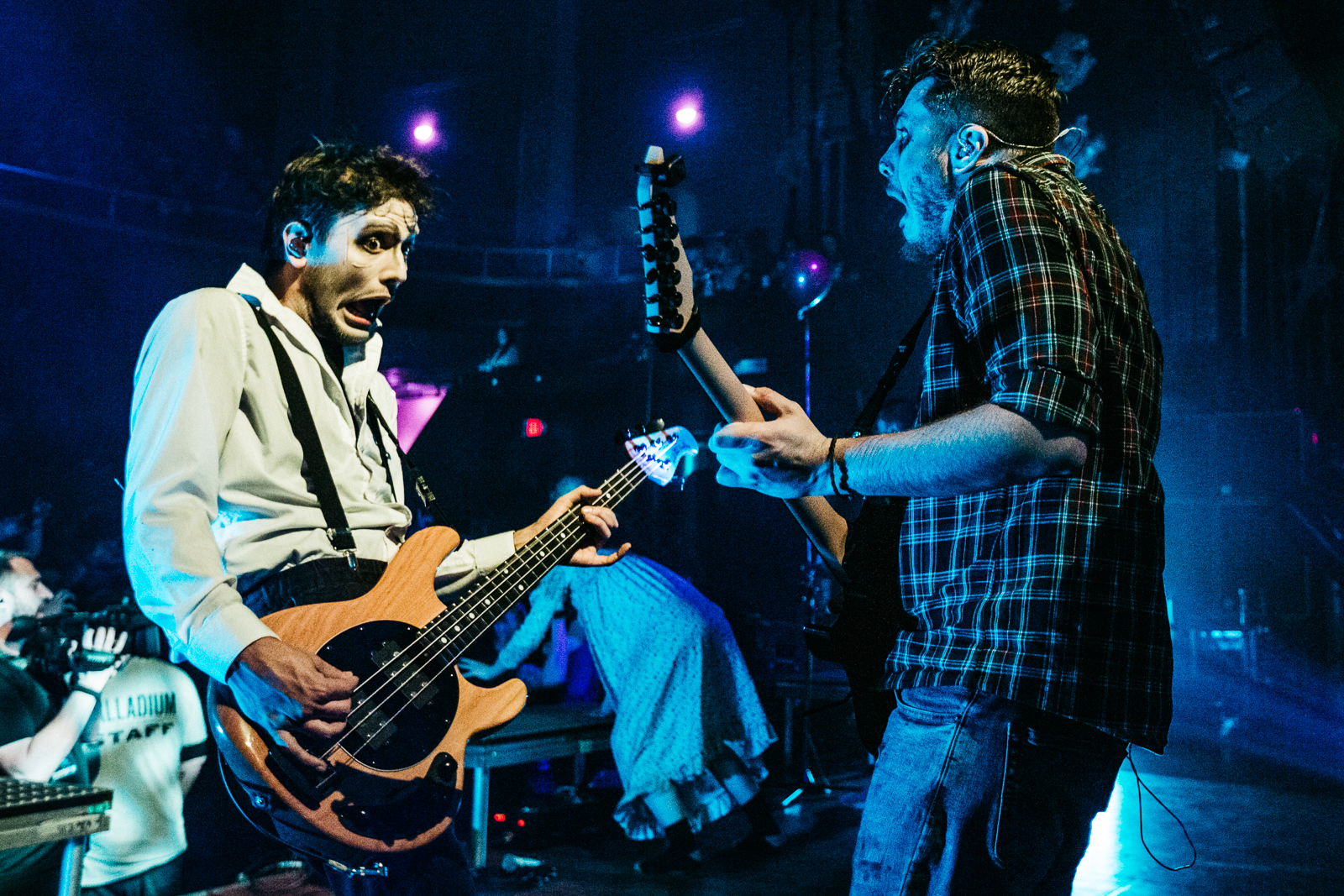 Horror being the part and parcel of this band, The Silver Stream borrowed clips from their Worcester, MA tour of The Silver Scream album but padded it out with sketches between to keep fans entertained and make the bang worth the buck. Before the show began the band took us on set behind the making of their favourite horror movies, giving a personal touch and emphasizing their passions for the horror noir shared with their audience. Mocking webcam-horror movies like Unfriended, the band create a sketch within the online web conference where each of them is plucked off one by one by a murderer who preys on their band internet. It gives nice breaks between each pre-recorded live set and, though fake, uses a realistic medium to give that realistic “are they actually dead?” vibe.