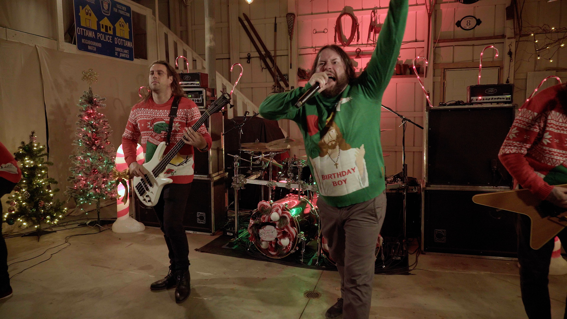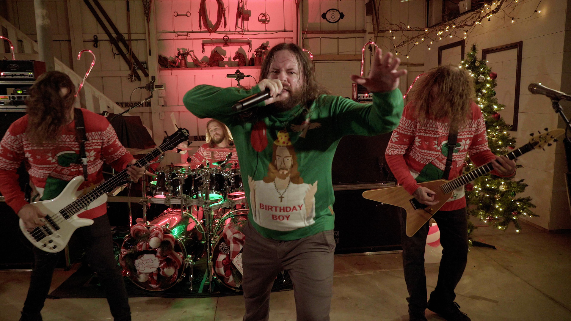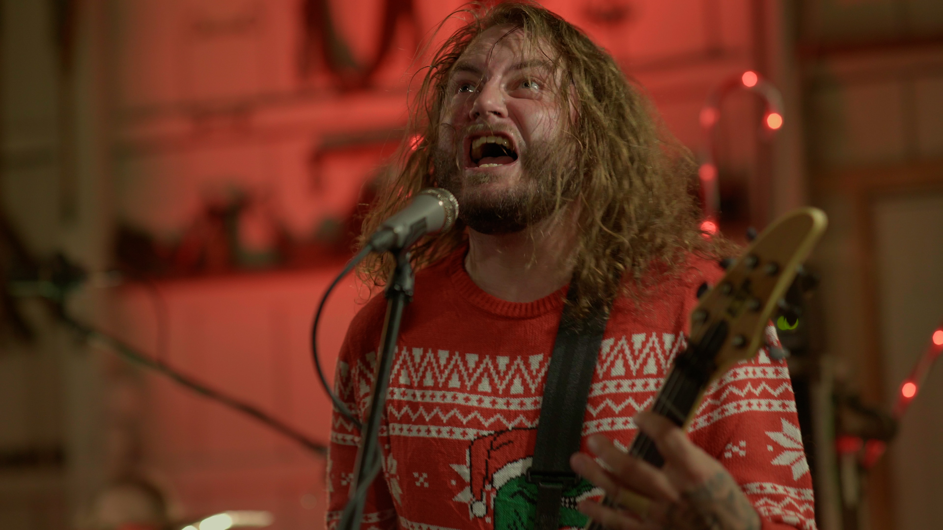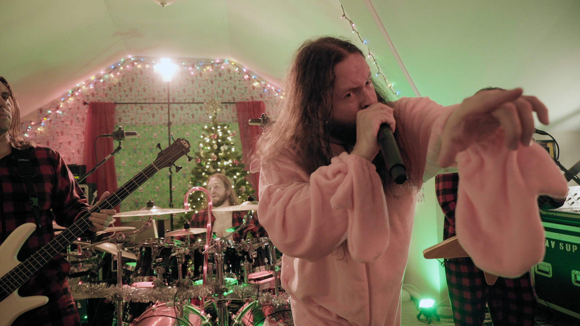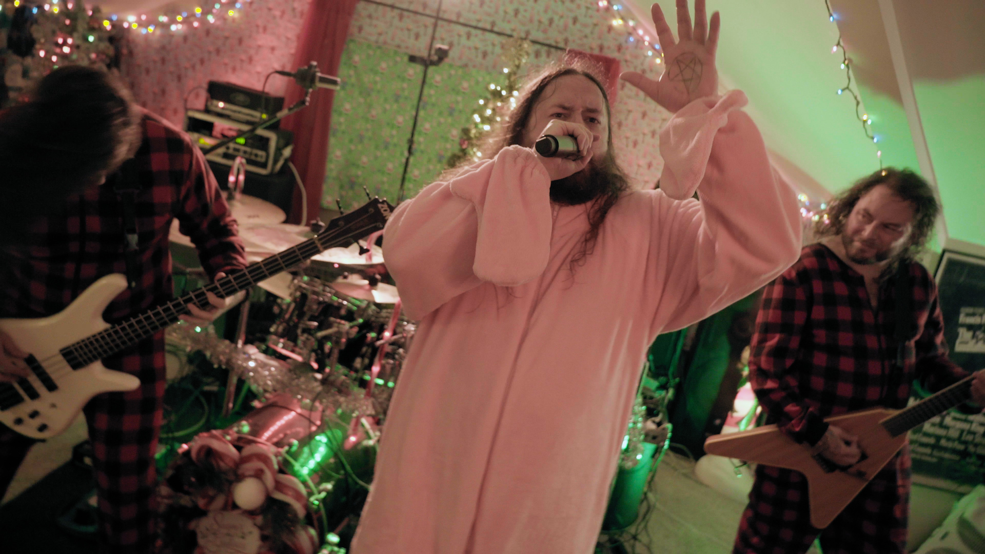 The illustrious task of presenting tonight’s feral festivities falls to eccentric oddball-cum-funnyman Neil Hamburger, whose bizarre banter and entirely inappropriate jokes delivered from beside a crackling fire is more SNL than The Night Before Christmas wholesomeness. Cut to an explosion of canned laughter and the band passing a bong around a dining table, the first in a series of comedic skits swiftly segues into a four-song set from the livestream’s first ‘venue’ of the evening with talisman Trevor Strnad – fully decked out in a pink bunny outfit – piledriving headfirst into a frenzied Funeral Thirst with enough bug-eyed vocal ferocity to peel the very enamel from your teeth.