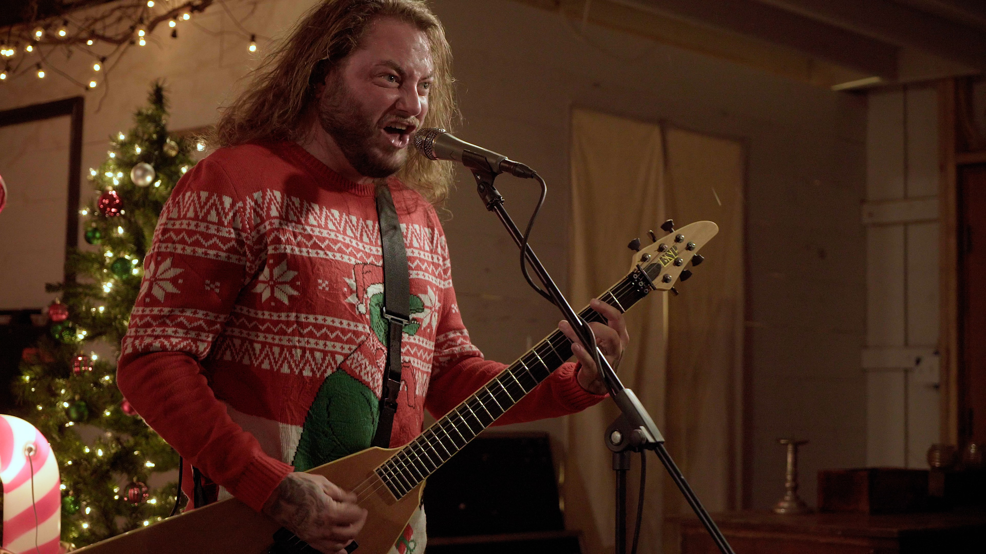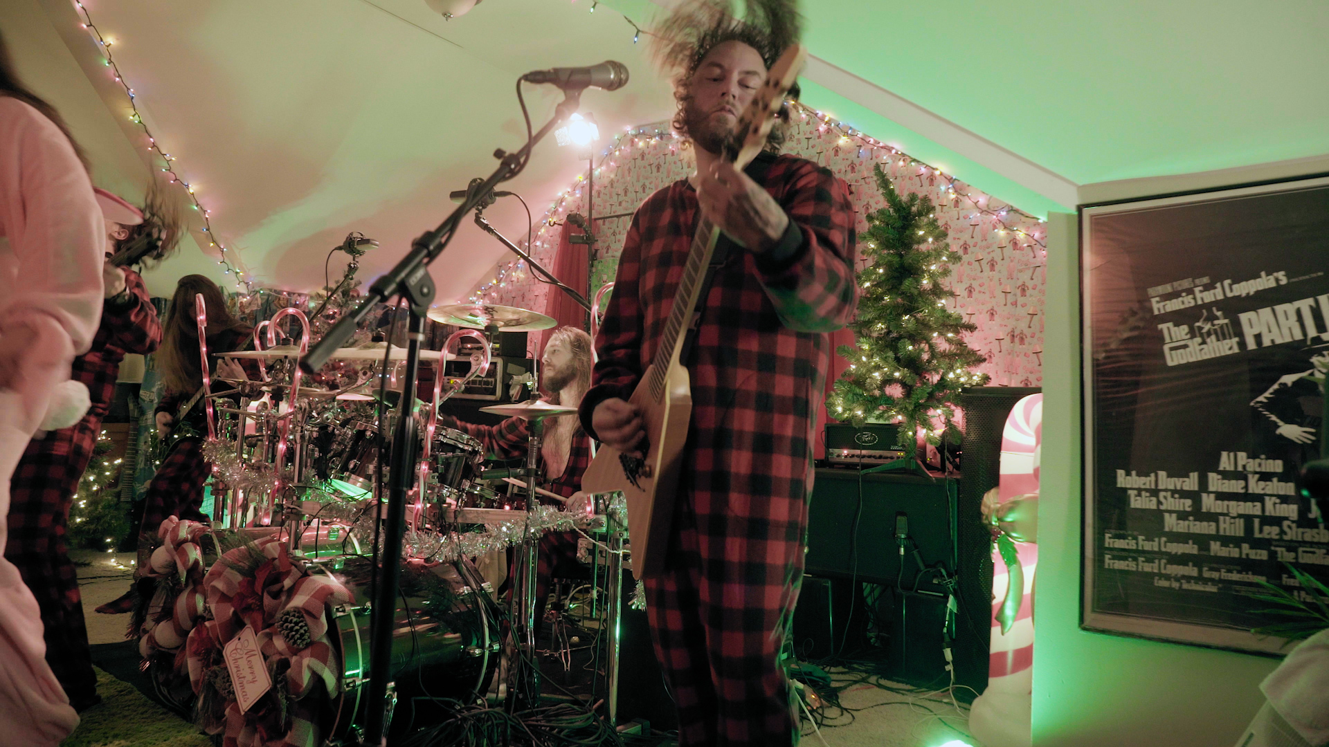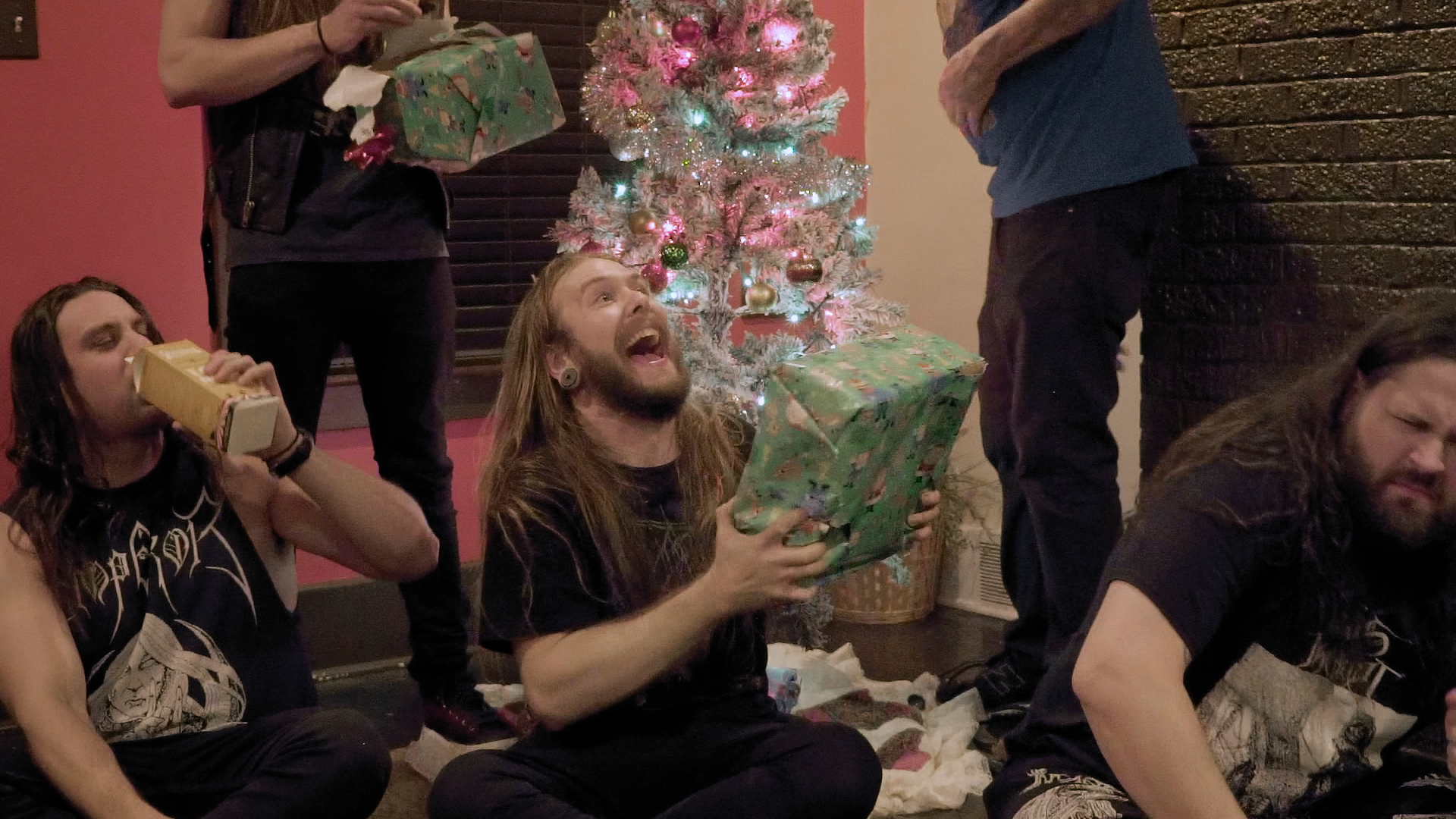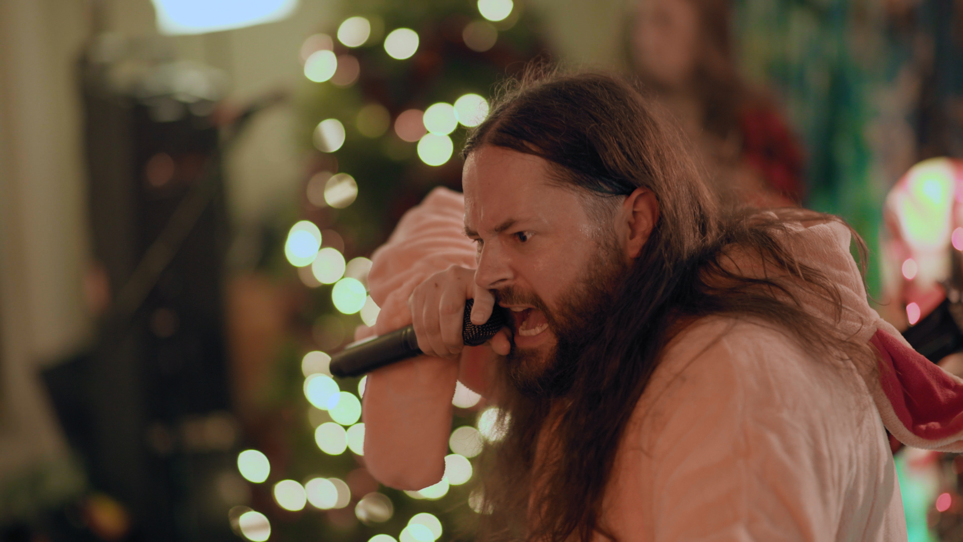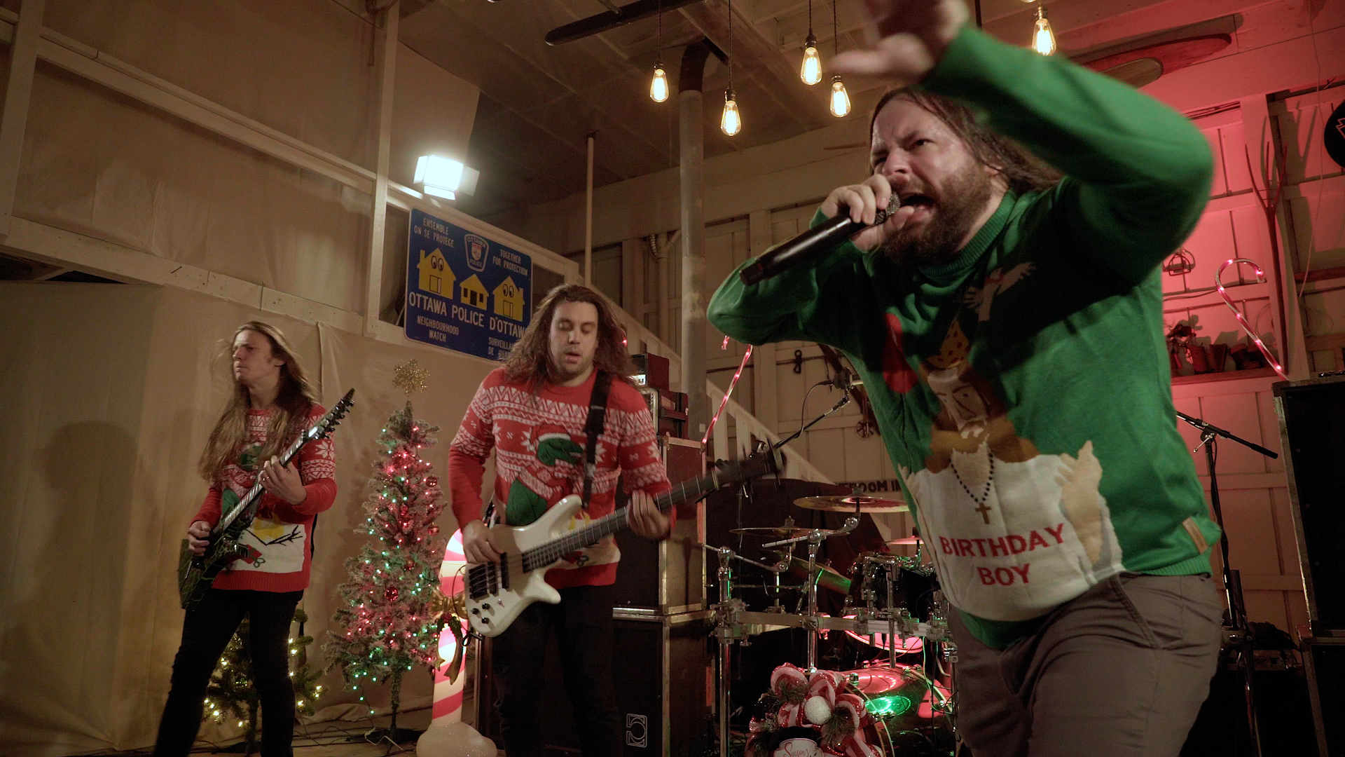 The illustrious task of presenting tonight’s feral festivities falls to eccentric oddball-cum-funnyman Neil Hamburger, whose bizarre banter and entirely inappropriate jokes delivered from beside a crackling fire is more SNL than The Night Before Christmas wholesomeness. Cut to an explosion of canned laughter and the band passing a bong around a dining table, the first in a series of comedic skits swiftly segues into a four-song set from the livestream’s first ‘venue’ of the evening with talisman Trevor Strnad – fully decked out in a pink bunny outfit – piledriving headfirst into a frenzied Funeral Thirst with enough bug-eyed vocal ferocity to peel the very enamel from your teeth.