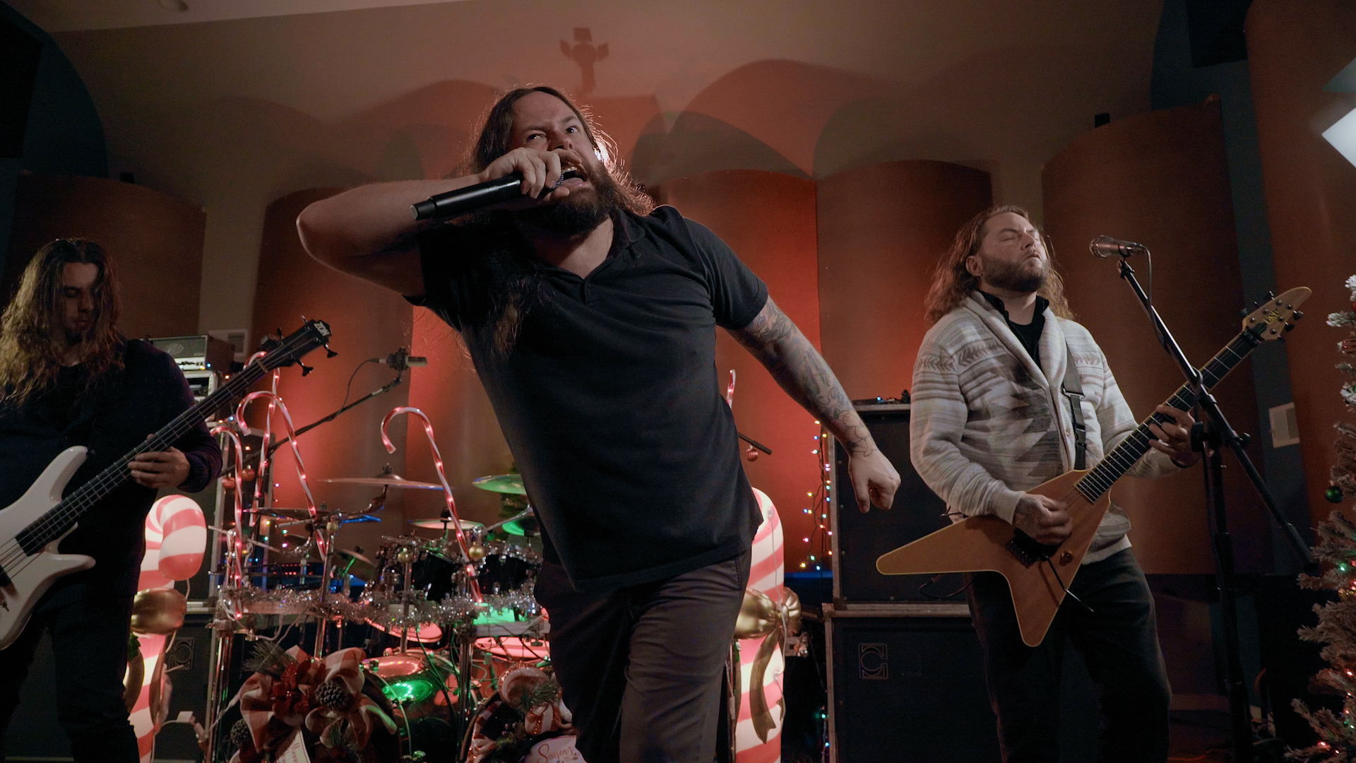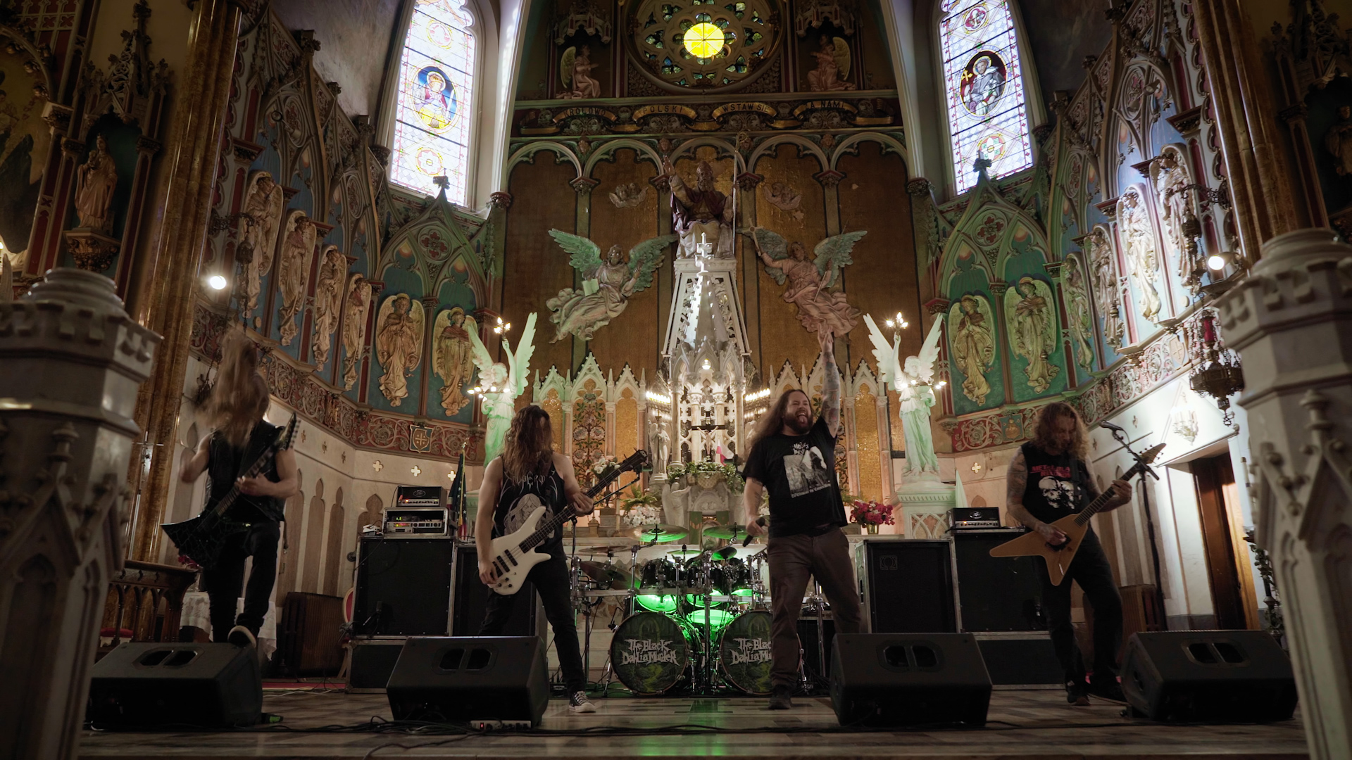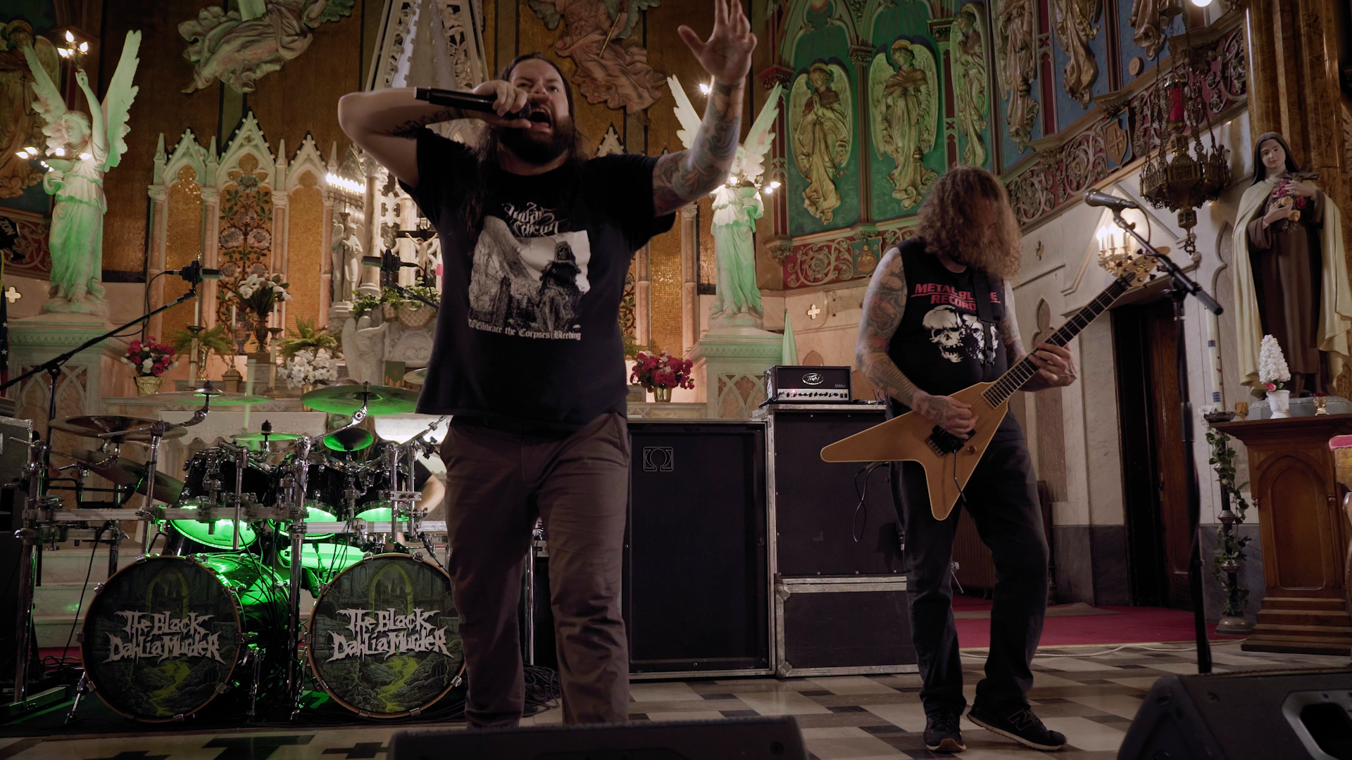 There’s just enough time to squeeze in one more festive skit; this time it’s the guys chasing off saccharine carol singers outside a random house, with bongos, before asking an unseen resident if they can come in and take a shit. Those silver-tongued charmers. And as the final location of this holiday extravaganza is revealed, it’s obvious that the best – in terms of musical panache and atmosphere – has been saved for last. Flanked by religious iconography and illuminated by swathes of light streaming in via the vast stained glass windows, there’s never been a more gloriously blasphemous juxtaposition as THE BLACK DAHLIA MURDER deliver four thunderous offerings from latest opus Verminous. From the title track’s compelling filth to Removal of the Oaken Stake’s blackened melancholy and the stomping grooves of Sunless Empire, it’s a dynamic display from a modern death metal band at the very top of their game. The credits roll amongst a plethora of gratuitous nudity, booze and a curious kitty rounding off a night of the festive and the feral.