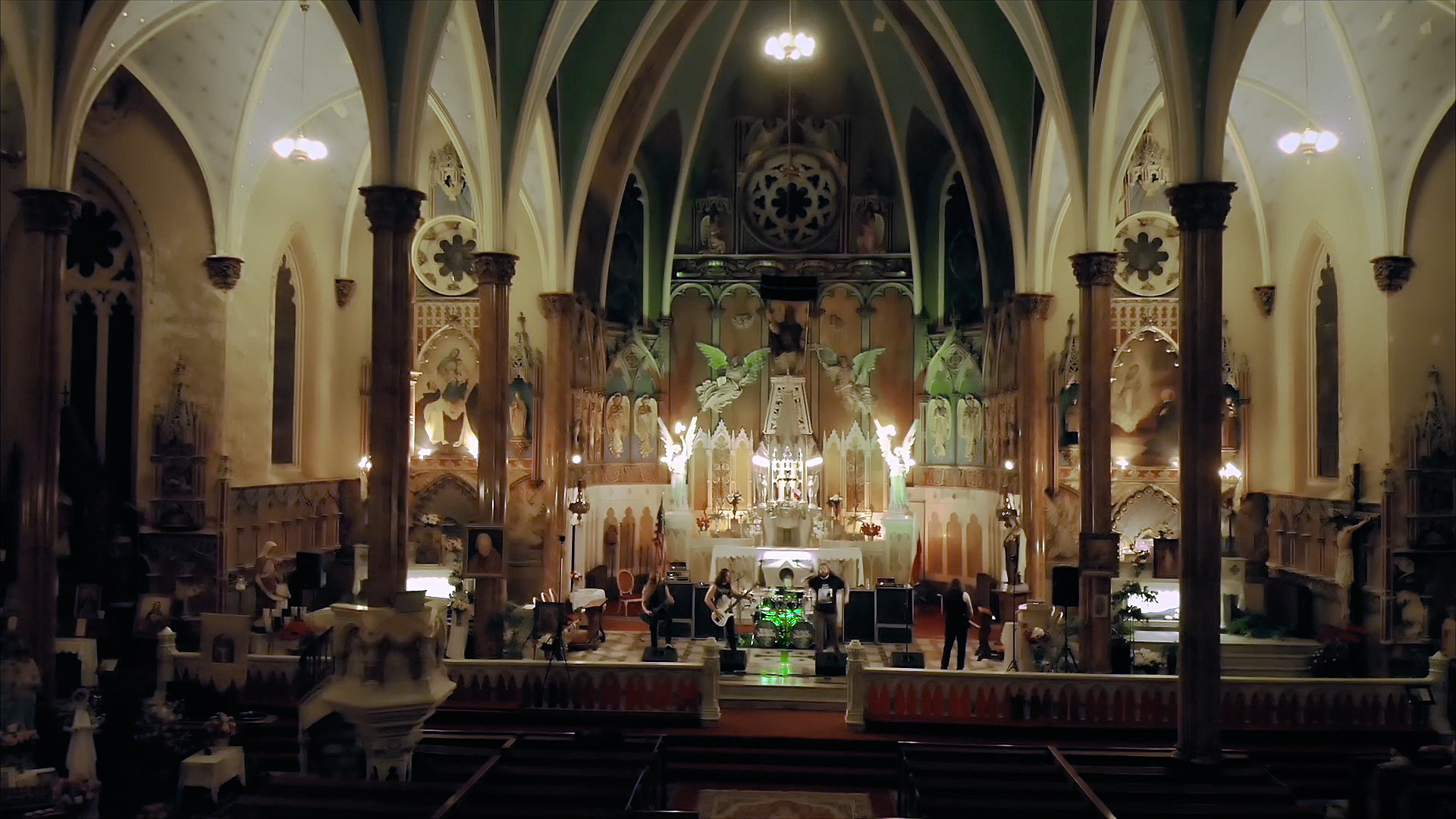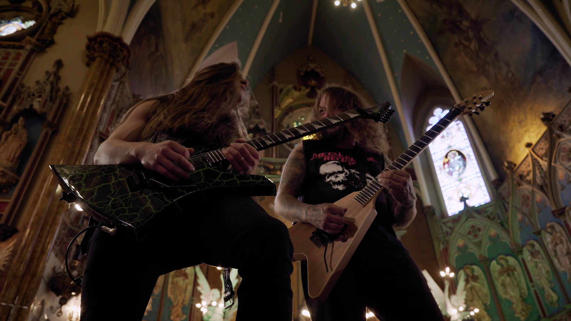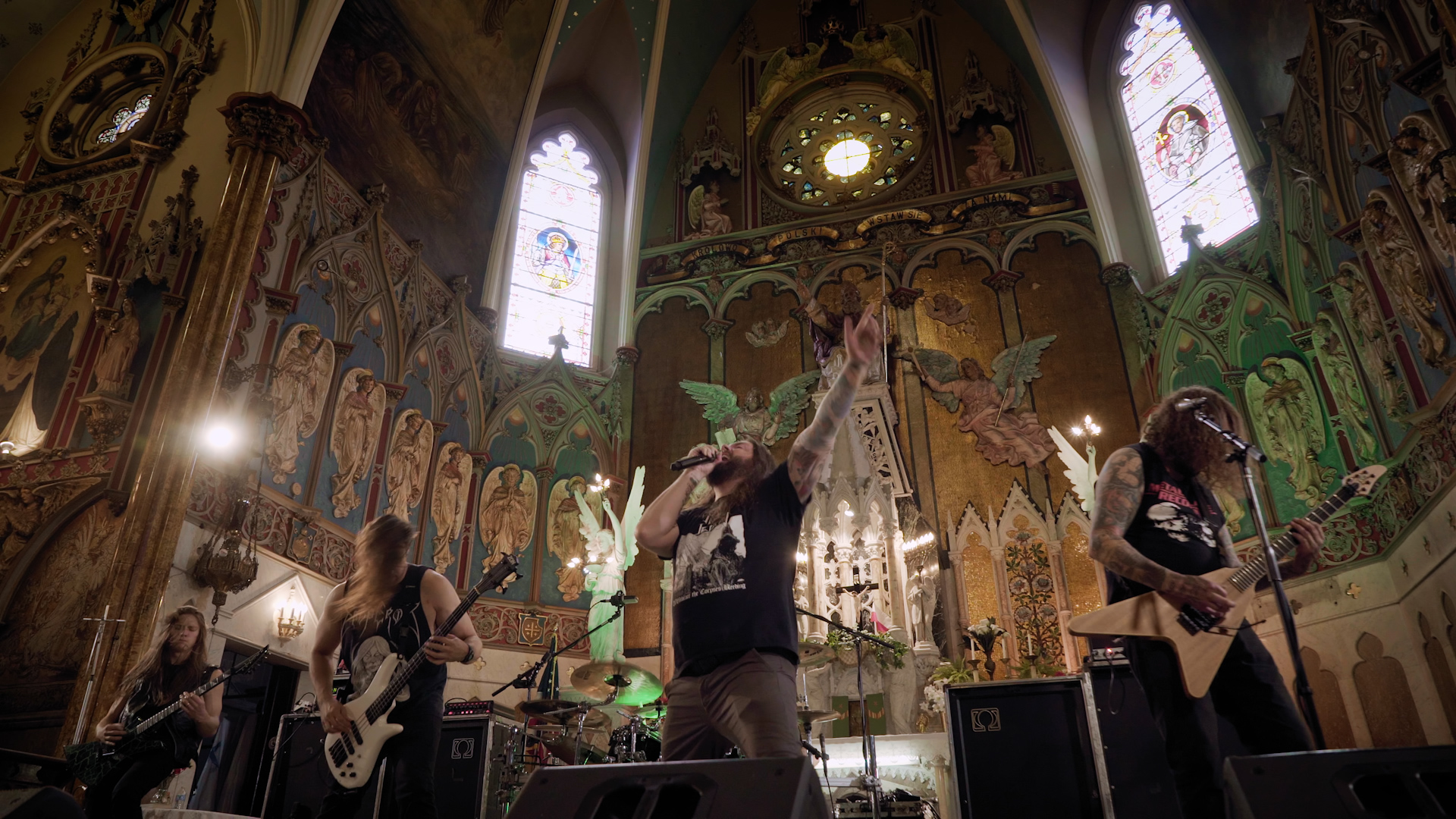 There’s just enough time to squeeze in one more festive skit; this time it’s the guys chasing off saccharine carol singers outside a random house, with bongos, before asking an unseen resident if they can come in and take a shit. Those silver-tongued charmers. And as the final location of this holiday extravaganza is revealed, it’s obvious that the best – in terms of musical panache and atmosphere – has been saved for last. Flanked by religious iconography and illuminated by swathes of light streaming in via the vast stained glass windows, there’s never been a more gloriously blasphemous juxtaposition as THE BLACK DAHLIA MURDER deliver four thunderous offerings from latest opus Verminous. From the title track’s compelling filth to Removal of the Oaken Stake’s blackened melancholy and the stomping grooves of Sunless Empire, it’s a dynamic display from a modern death metal band at the very top of their game. The credits roll amongst a plethora of gratuitous nudity, booze and a curious kitty rounding off a night of the festive and the feral.