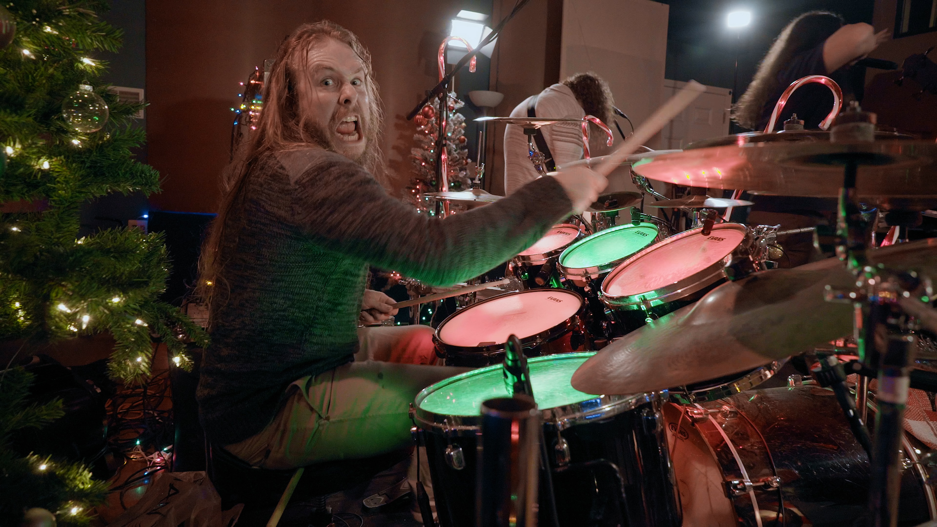 With more tinsel and lit up trees than you can shake a stick at, Contagion drops amongst a sea of red and green with all the strength of a hirsute hand grenade, packing sufficient sledgehammer riffs and blistering solos to instigate horns being thrown aloft in living rooms across the globe. There’s barely time for eager bloodshot eyeballs to register the animated Santa Claus visual whizzing across the screen before a doubleheader from 2005’s Miasma sees every member slamming their respective instrument as if they were in the potent grip of a violent seizure. The act of windmilling appears to have possessed both guitarist Brandon Ellis and bassist Max Lavelle while Trevor’s rabid howls of “In vengeance we are born, To our graves these grudges shall be sworn!” during classic cut Statutory Ape send his rabbit ears flapping about uncontrollably.