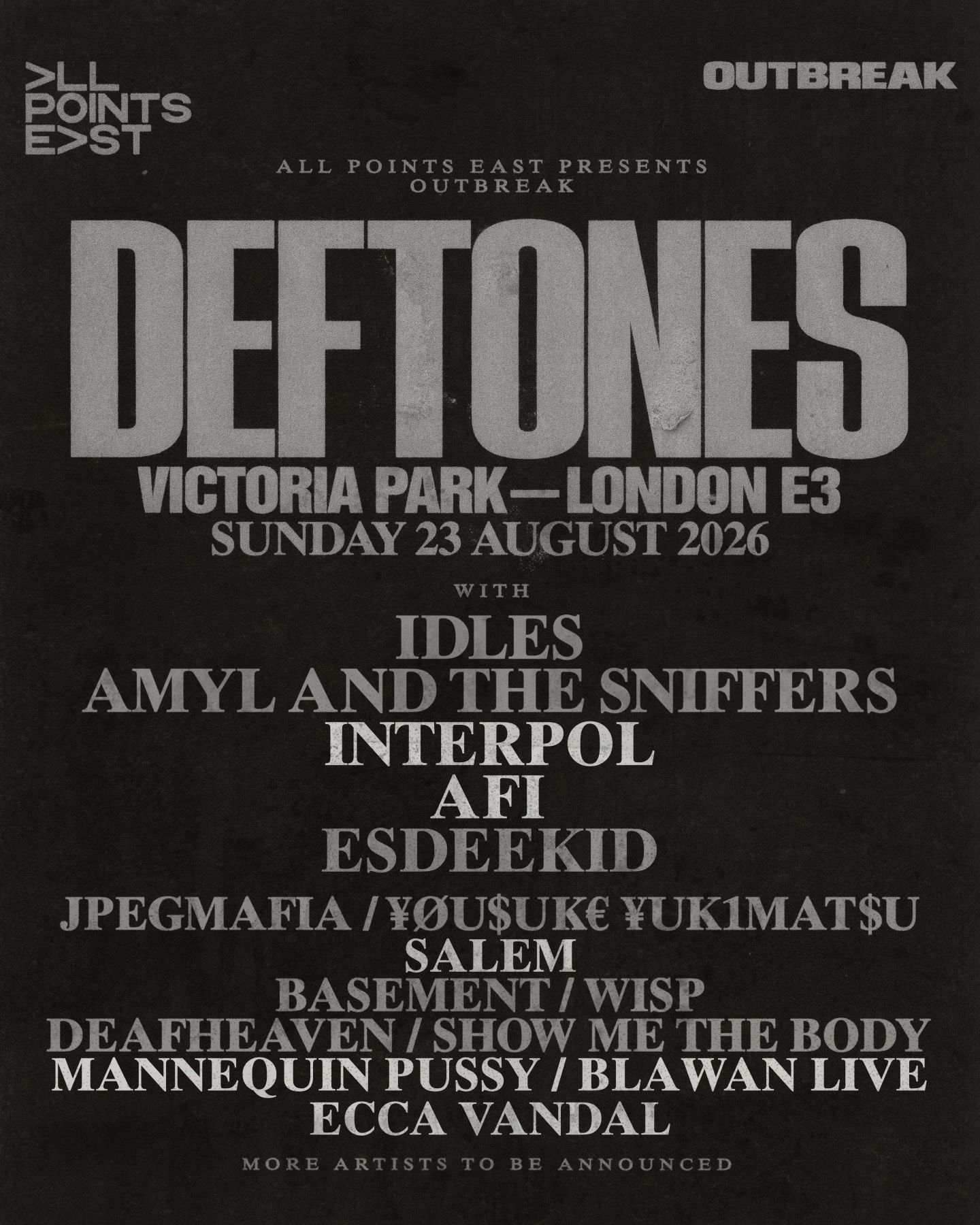Taking place on Sunday, August 23rd, 2026 at Victoria Park in London, the festival expands its lineup following the previously announced headliner DEFTONES, joined by IDLES, AMYL & THE SNIFFERS, JPEGMAFIA, and ESDEEKID.