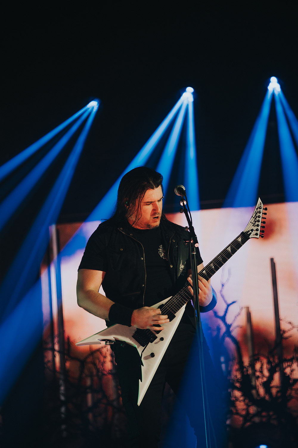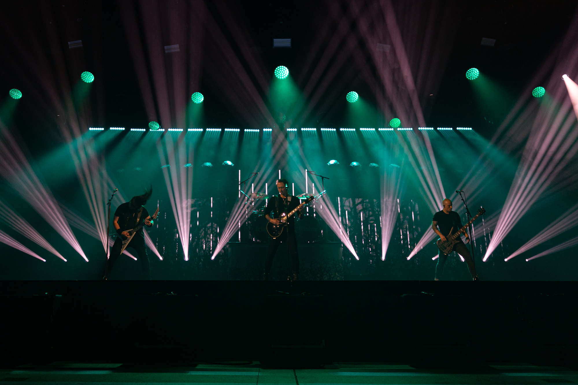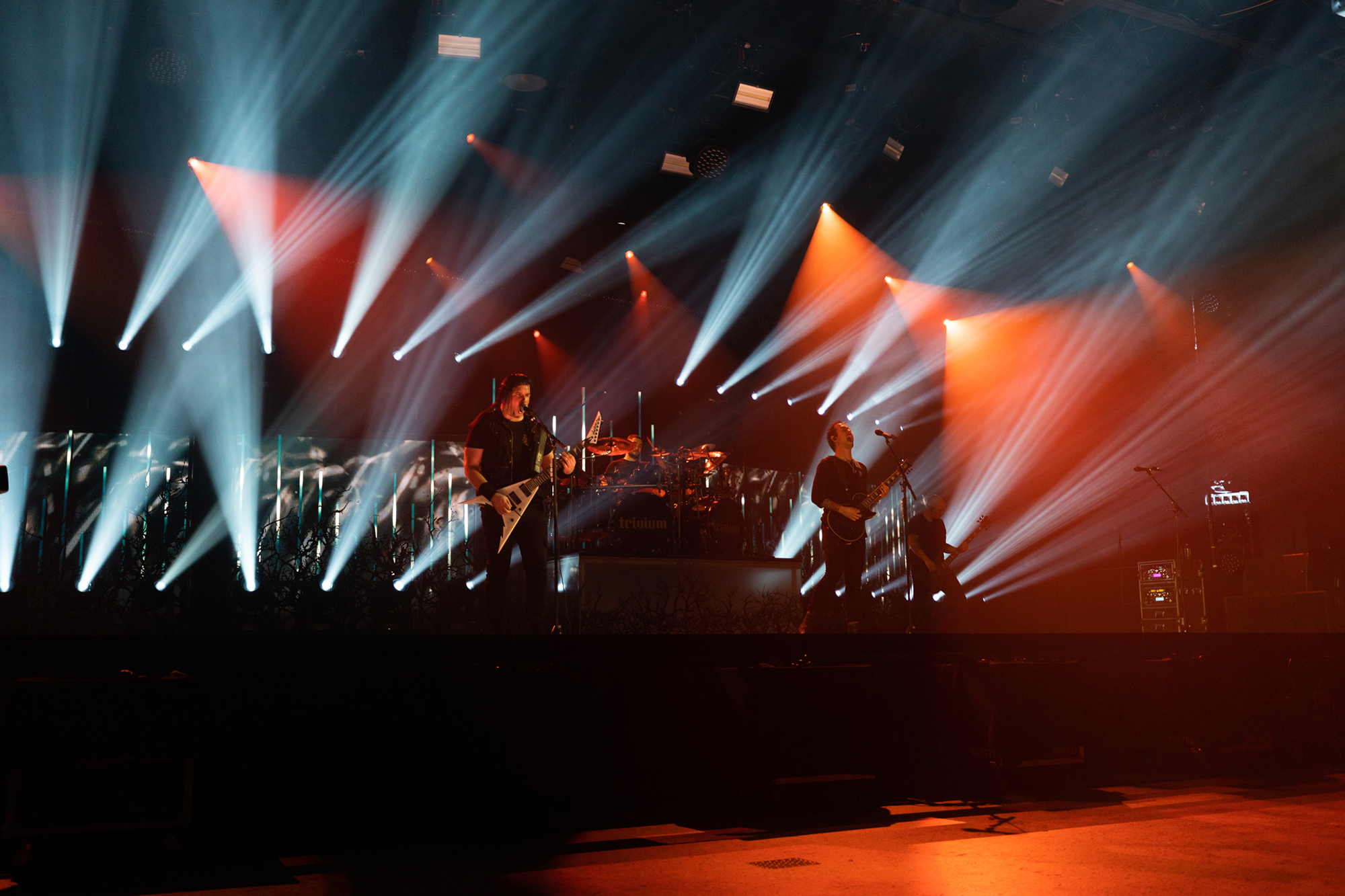 TRIVIUM managed to secure the services of renowned designer Sooner Ruthier to help design the set and create a lighting sequence. She has previously worked with bands such as MUSE, MÖTLEY CRÜE and KISS. “She’s one of the best lighting designers and operators in the business,” Paolo claims. “To have her there was really cool for us. She was there till two/three in the morning working on the lights in pre-production. She busted her ass and made it look incredible.” The set design was dark and moody but was contrasted well with powerful lighting and sharp production that helped boost the intensity of each track.